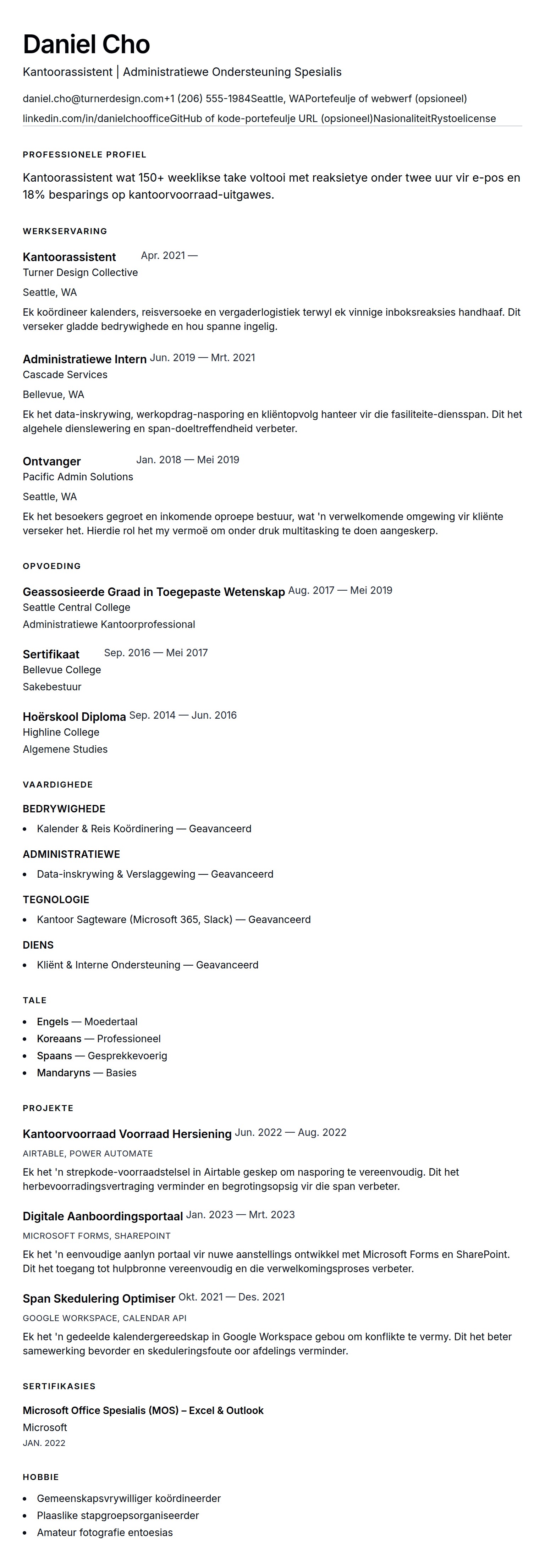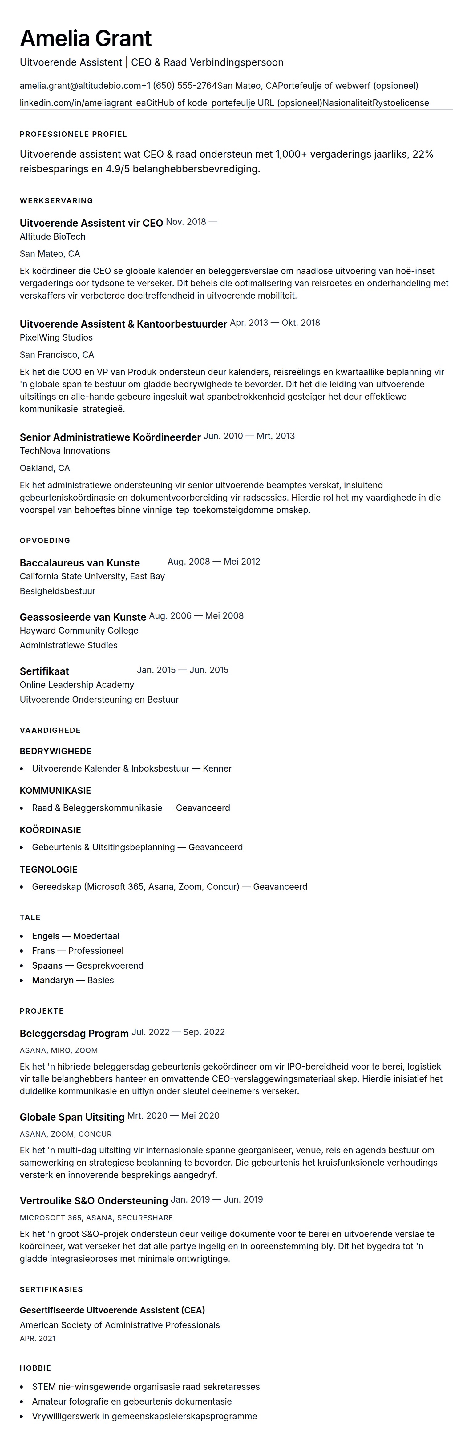 Uitvoerende Assistent Lewensloop Voorbeeld