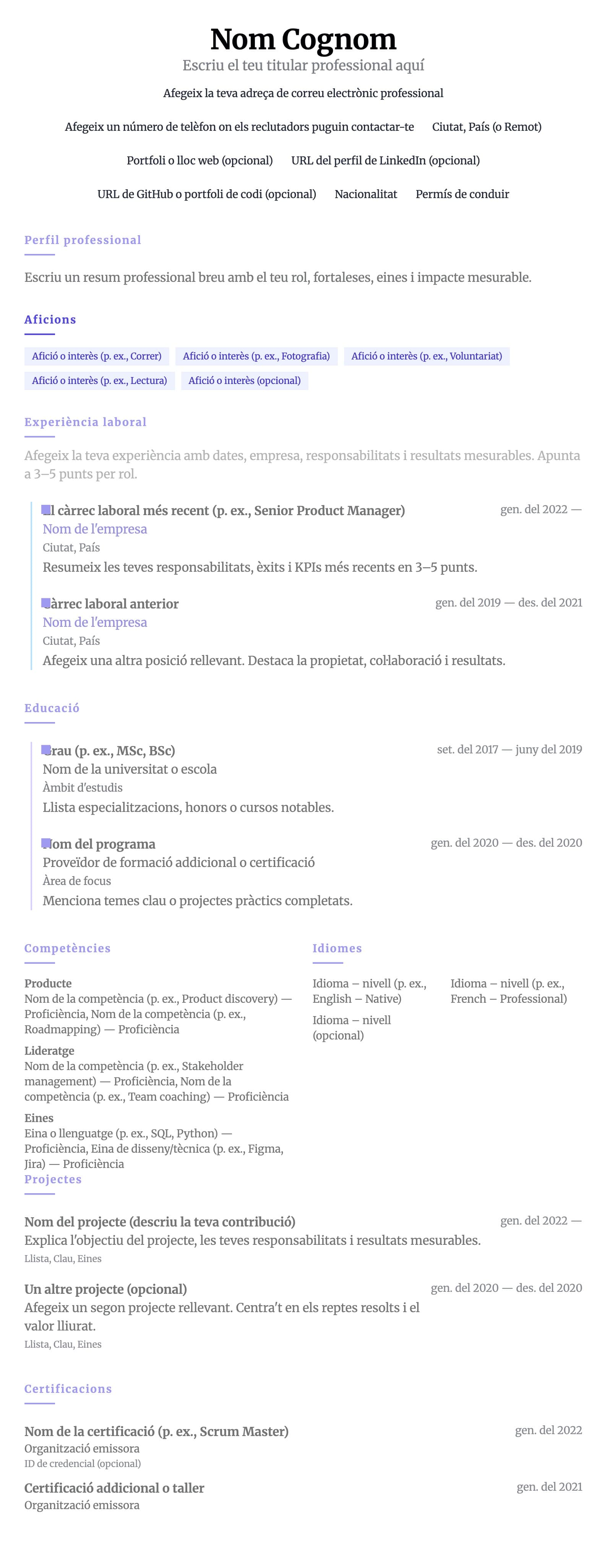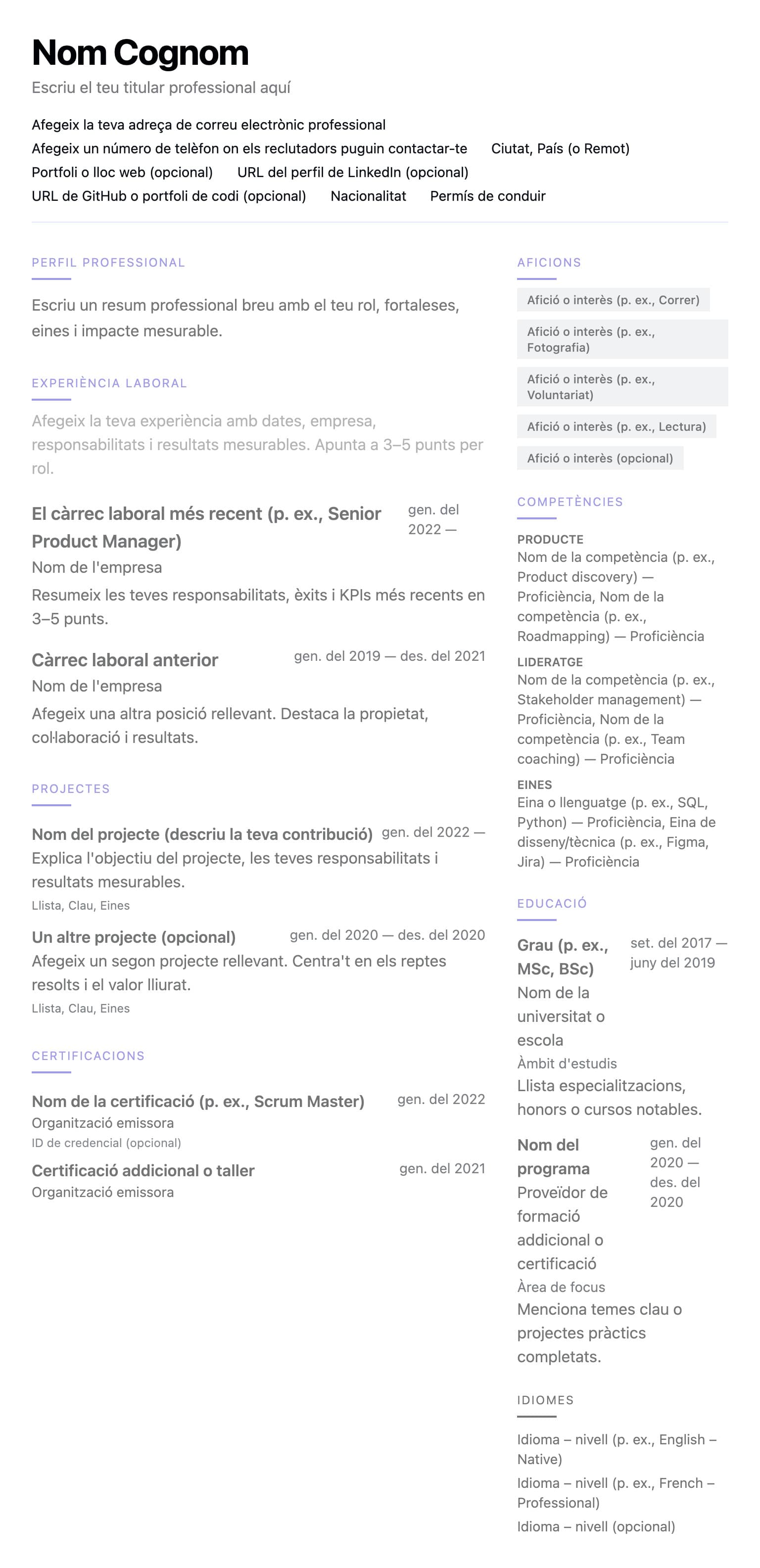 Disposició clara amb una barra lateral per a habilitats/idiomes