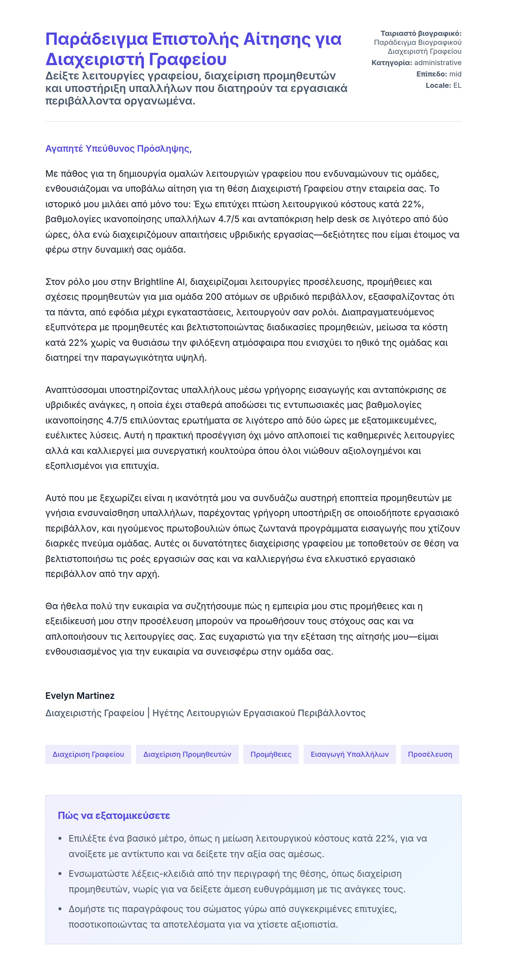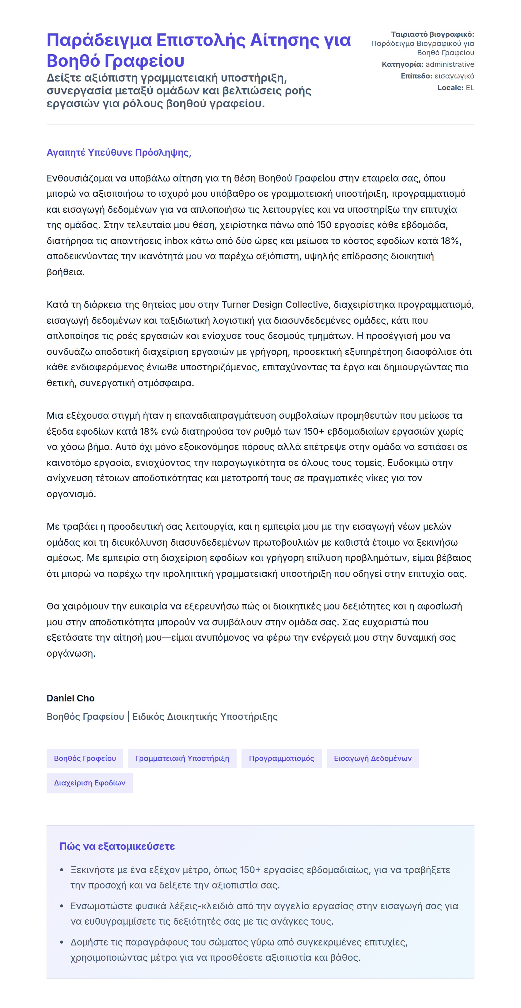 Δείξτε αξιόπιστη γραμματειακή υποστήριξη, συνεργασία μεταξύ ομάδων και βελτιώσεις ροής εργασιών για ρόλους βοηθού γραφείου.