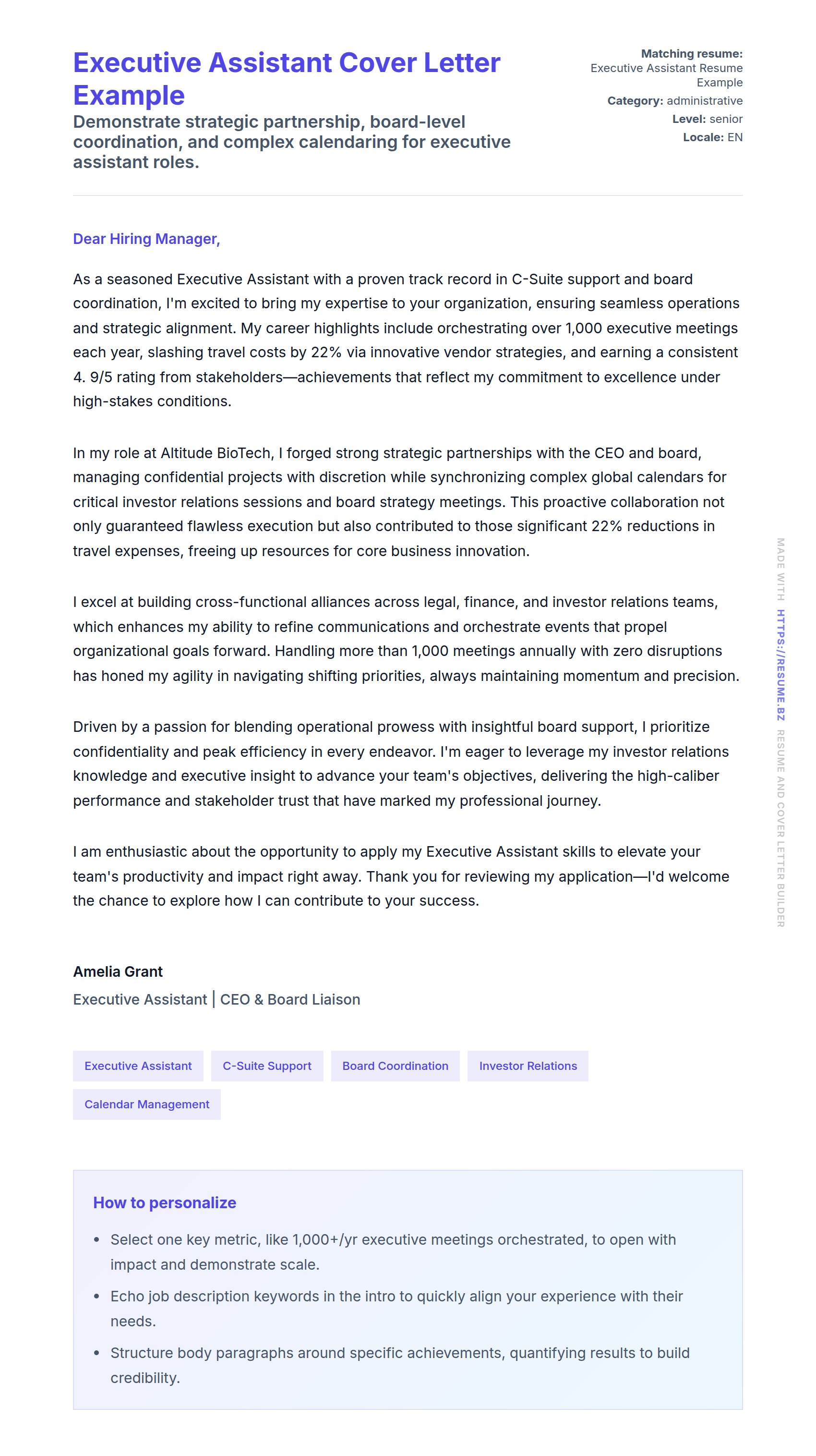 Demonstrate strategic partnership, board-level coordination, and complex calendaring for executive assistant roles.