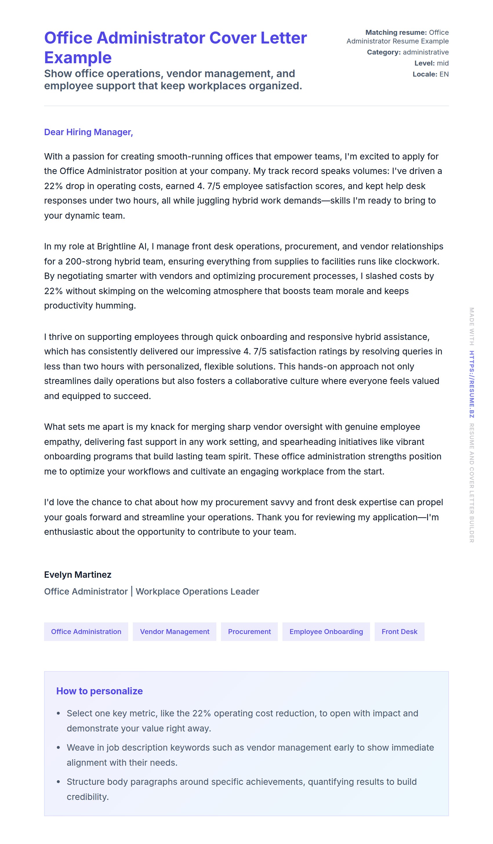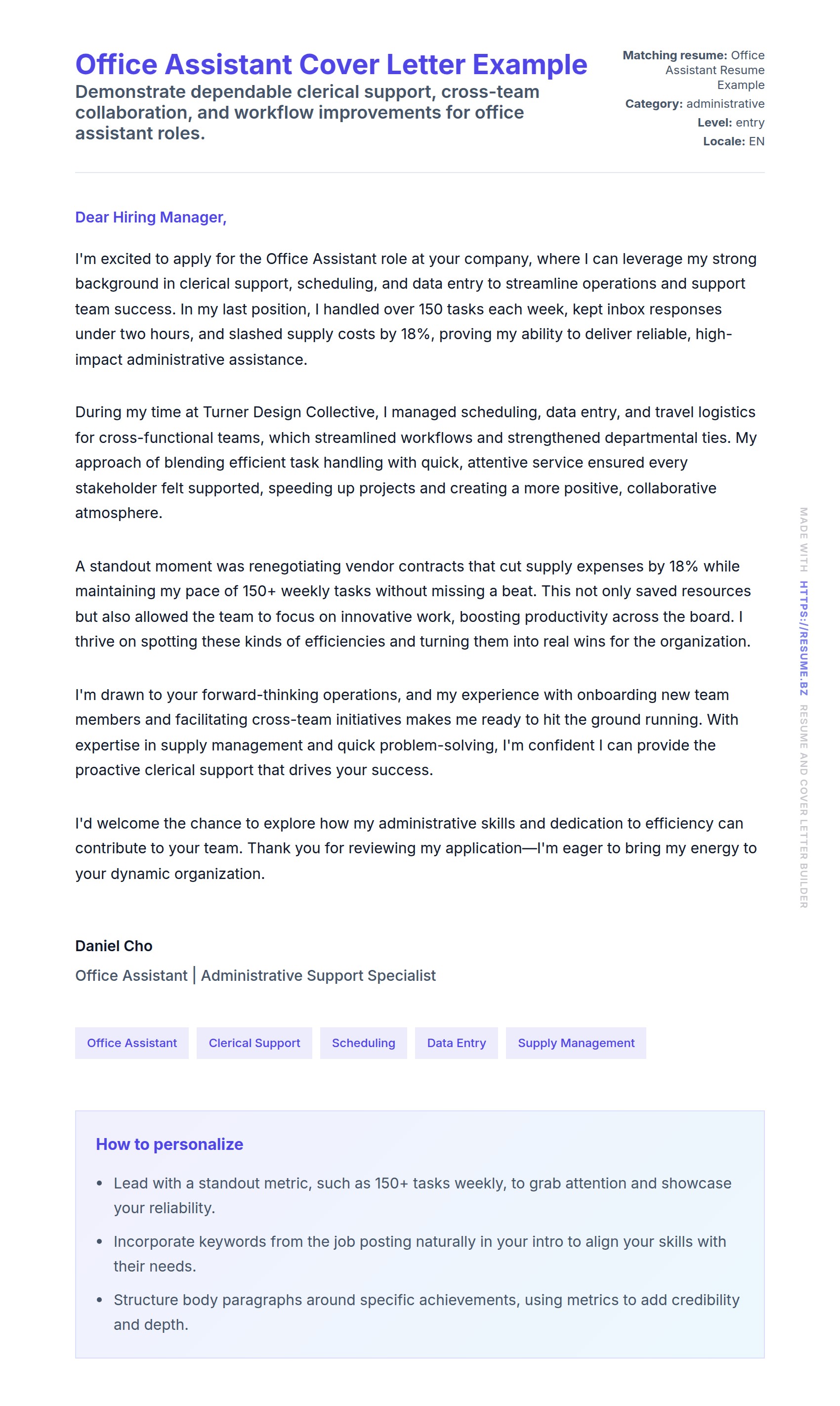 Demonstrate dependable clerical support, cross-team collaboration, and workflow improvements for office assistant roles.
