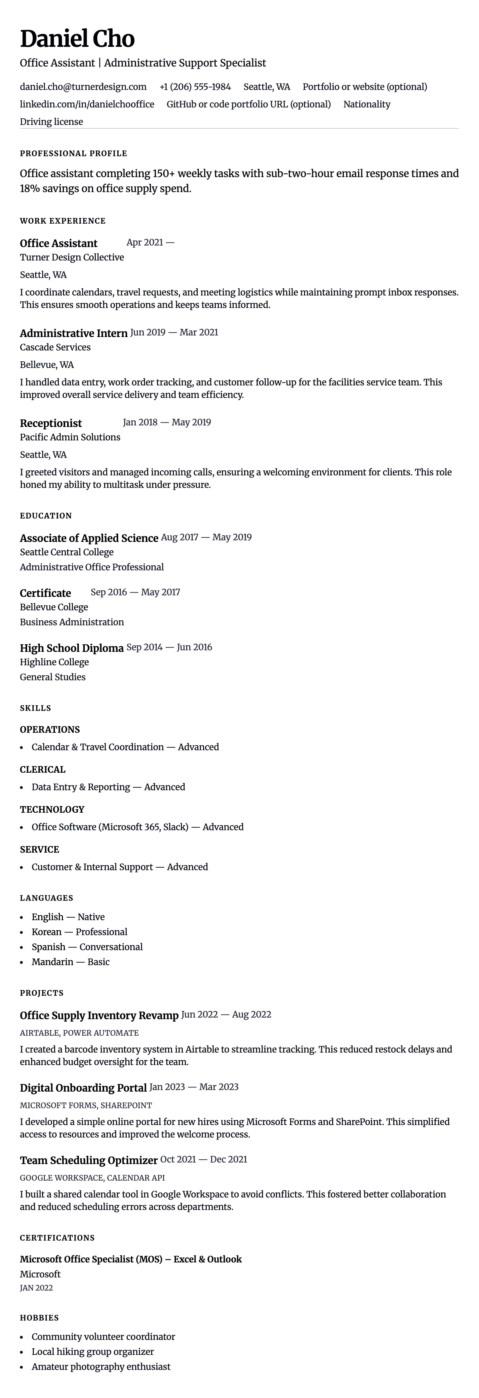 Demonstrate dependable clerical support, cross-team collaboration, and workflow improvements for office assistant roles.