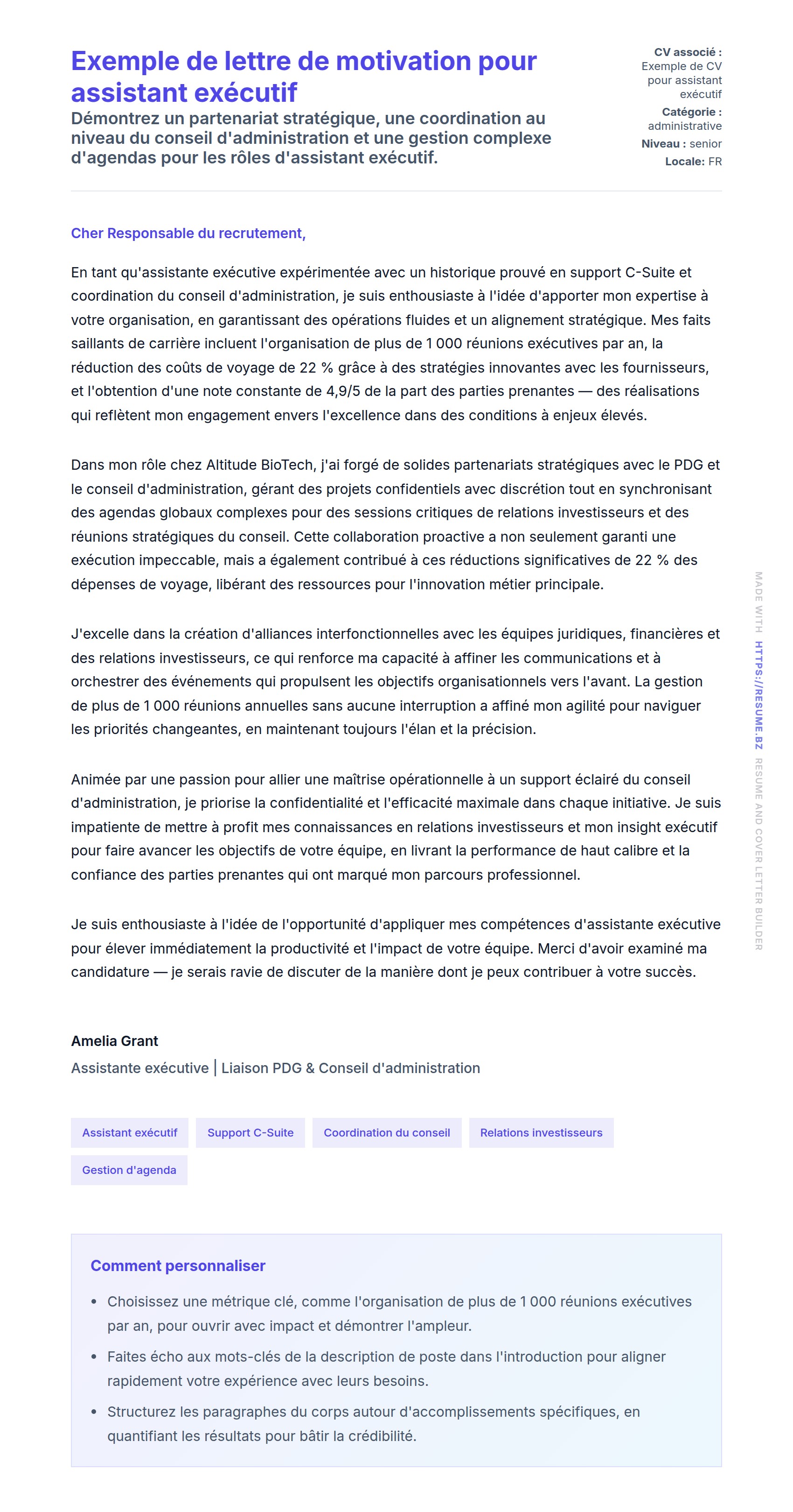 Démontrez un partenariat stratégique, une coordination au niveau du conseil d'administration et une gestion complexe d'agendas pour les rôles d'assistant exécutif.