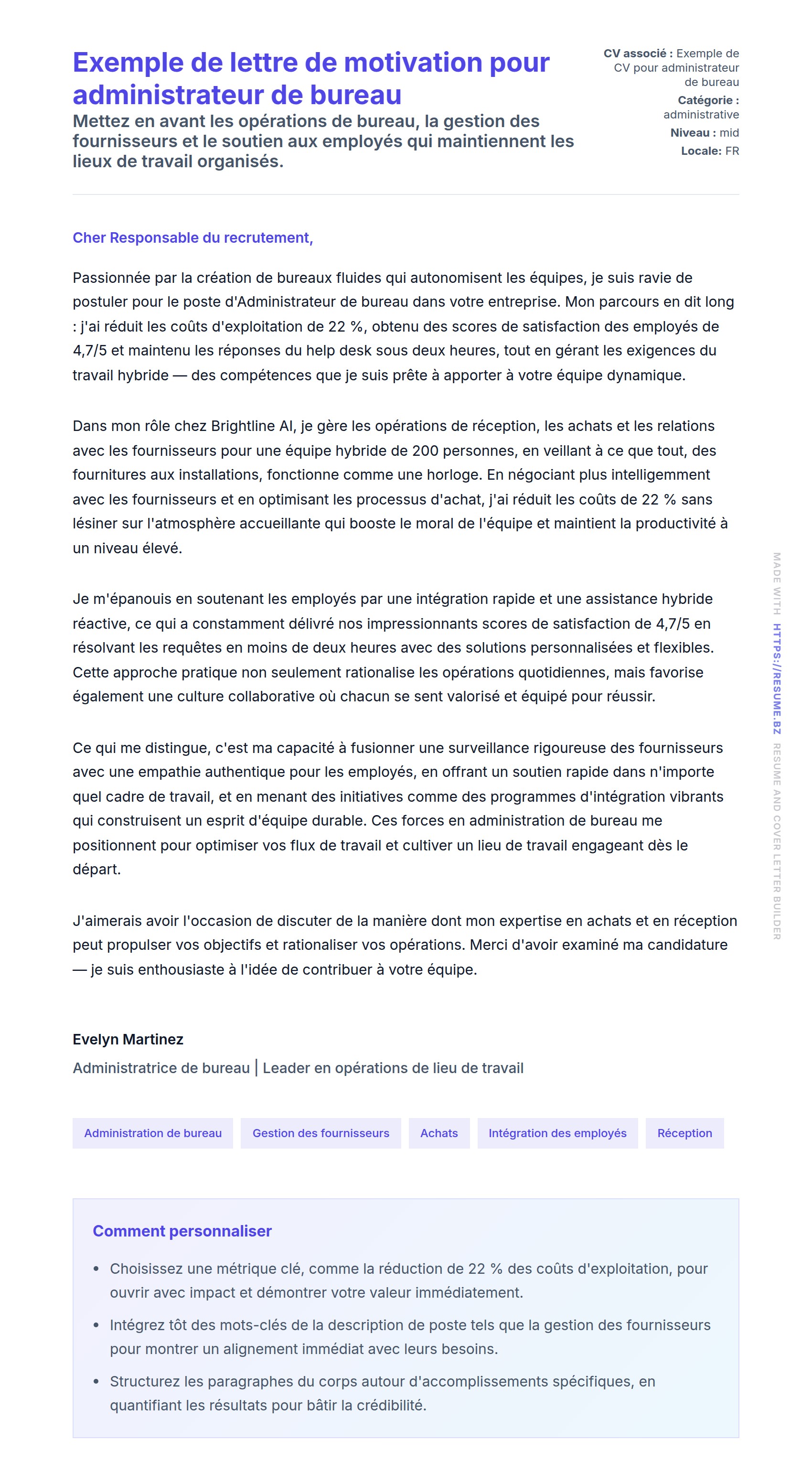 Mettez en avant les opérations de bureau, la gestion des fournisseurs et le soutien aux employés qui maintiennent les lieux de travail organisés.