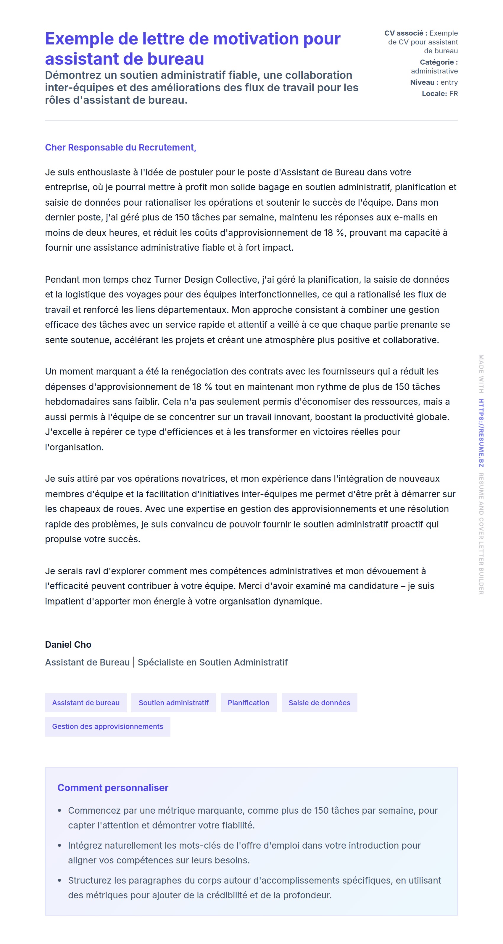 Démontrez un soutien administratif fiable, une collaboration inter-équipes et des améliorations des flux de travail pour les rôles d'assistant de bureau.