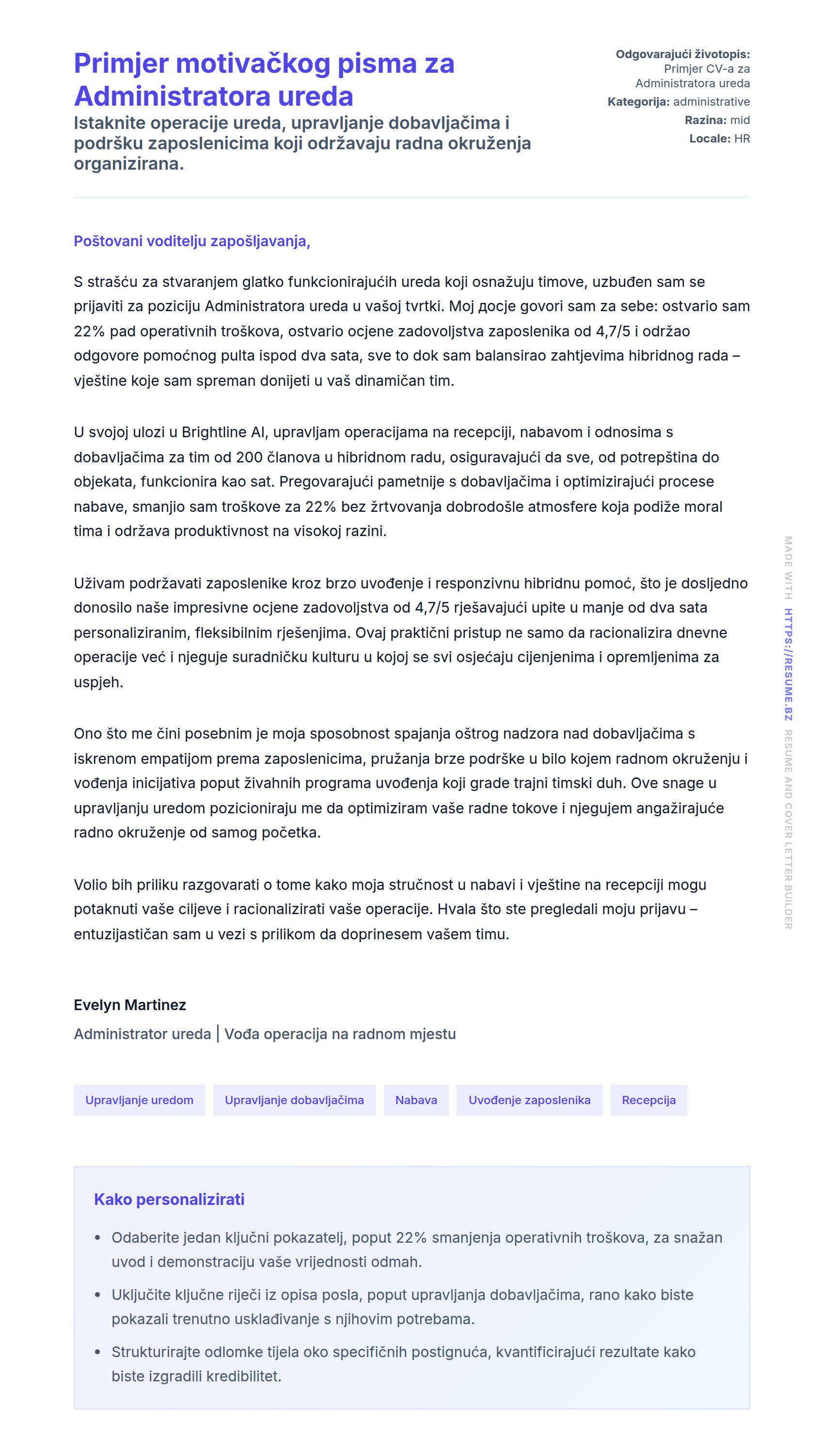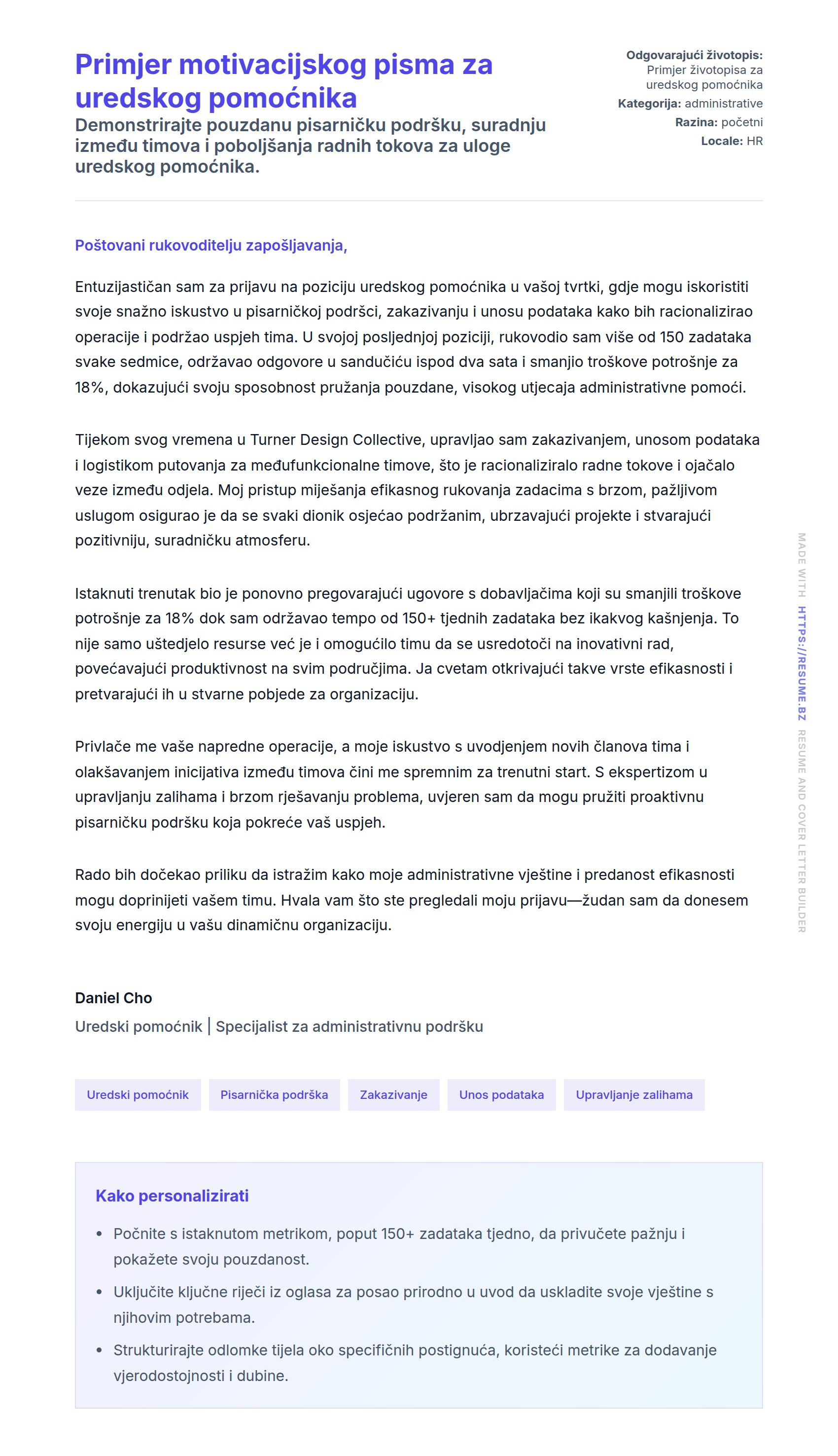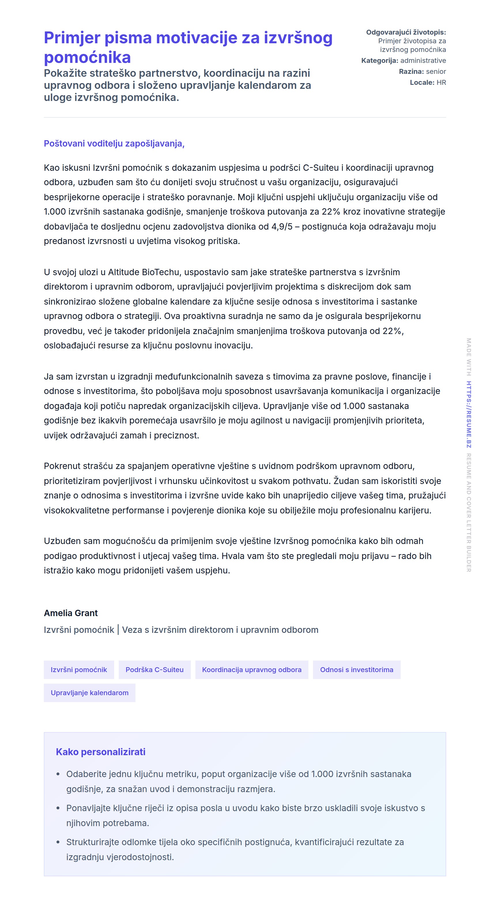 Primjer pisma motivacije za izvršnog pomoćnika