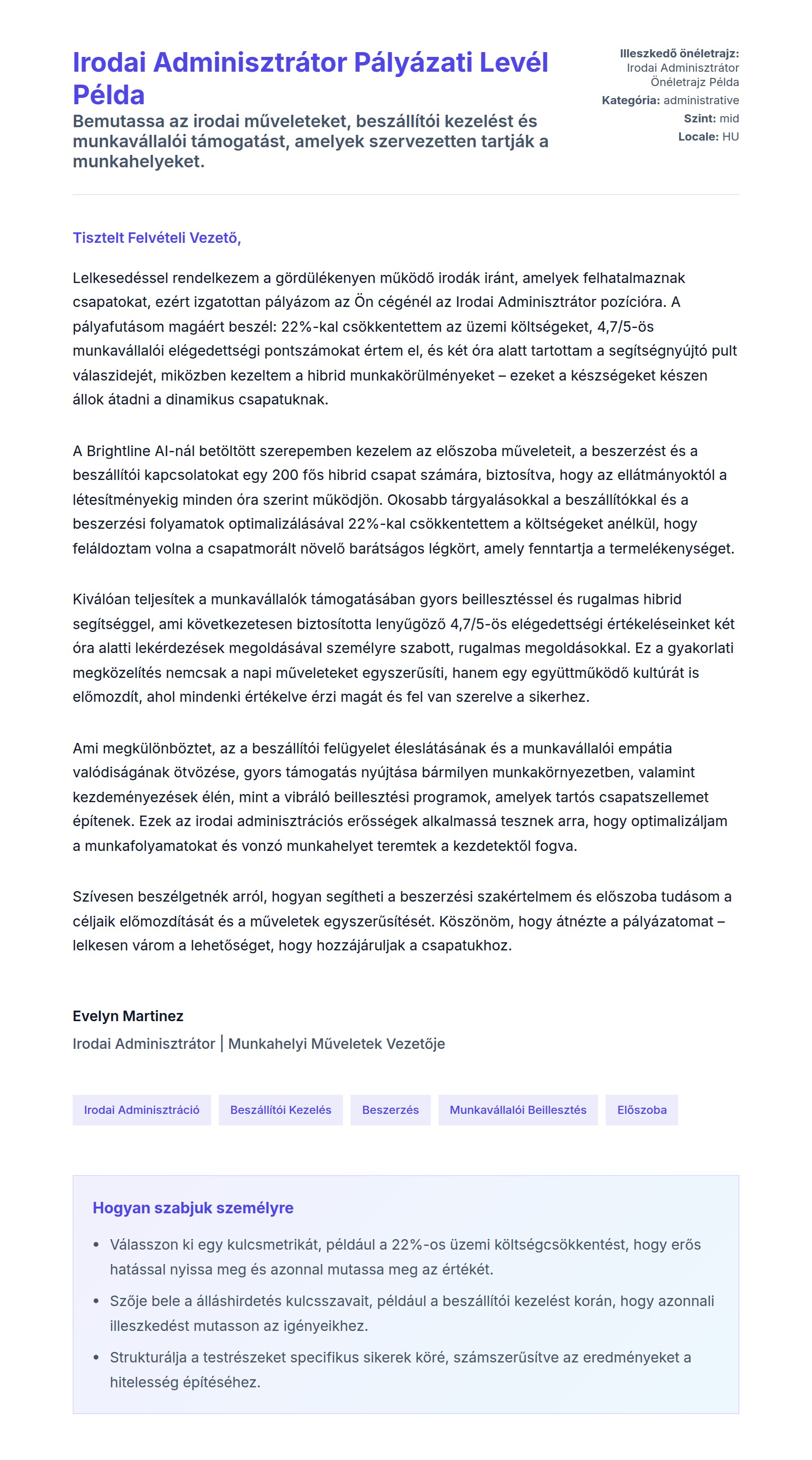 Fedezze fel a valós világbeli kísérőlevél példákat, szervezve szakma, tapasztalat szint és ország szerint. Nézze meg az élő előnézeteket, és tanulja meg, hogyan szabja testre minden példát a karriercéljaihoz.100% Ingyenes