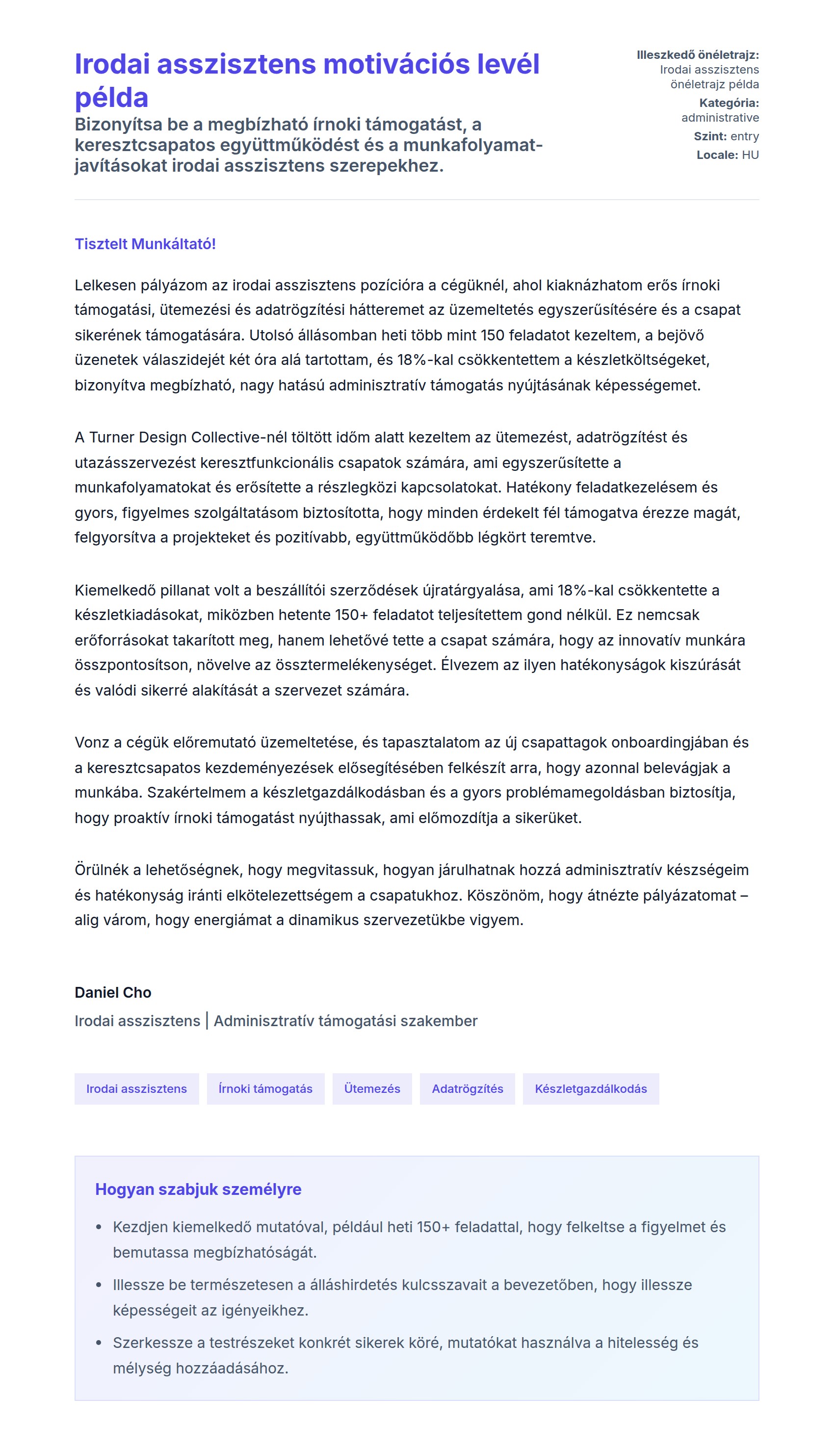 Bizonyítsa be a megbízható írnoki támogatást, a keresztcsapatos együttműködést és a munkafolyamat-javításokat irodai asszisztens szerepekhez.