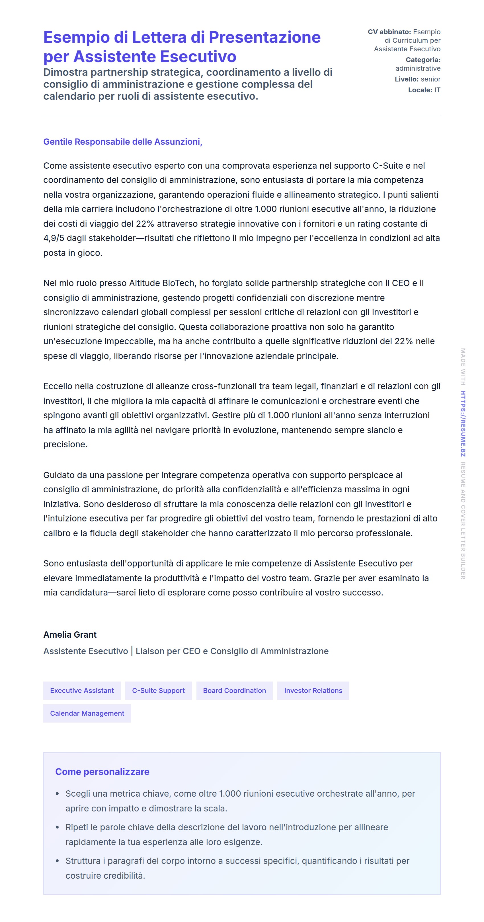Esempio di Lettera di Presentazione per Assistente Esecutivo