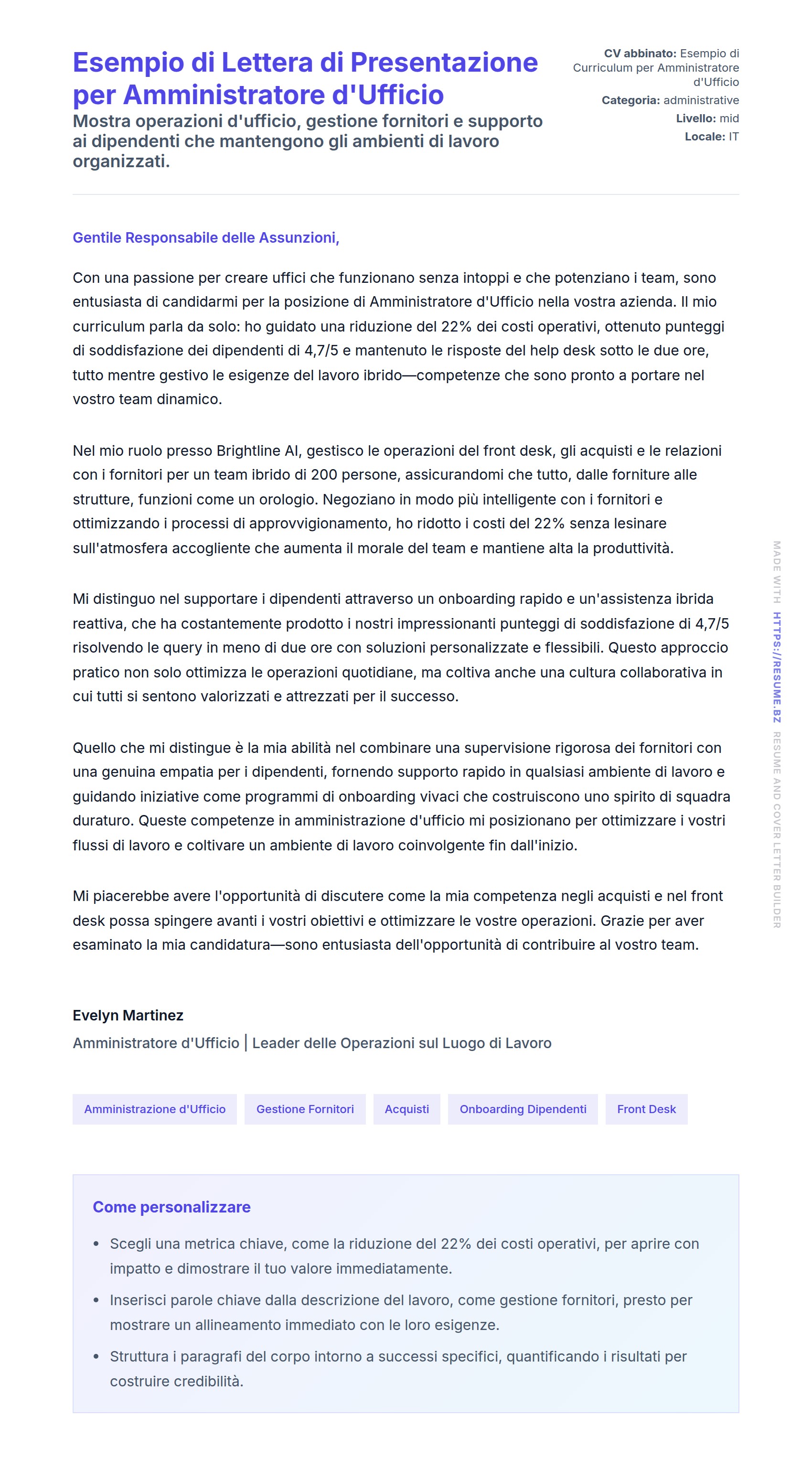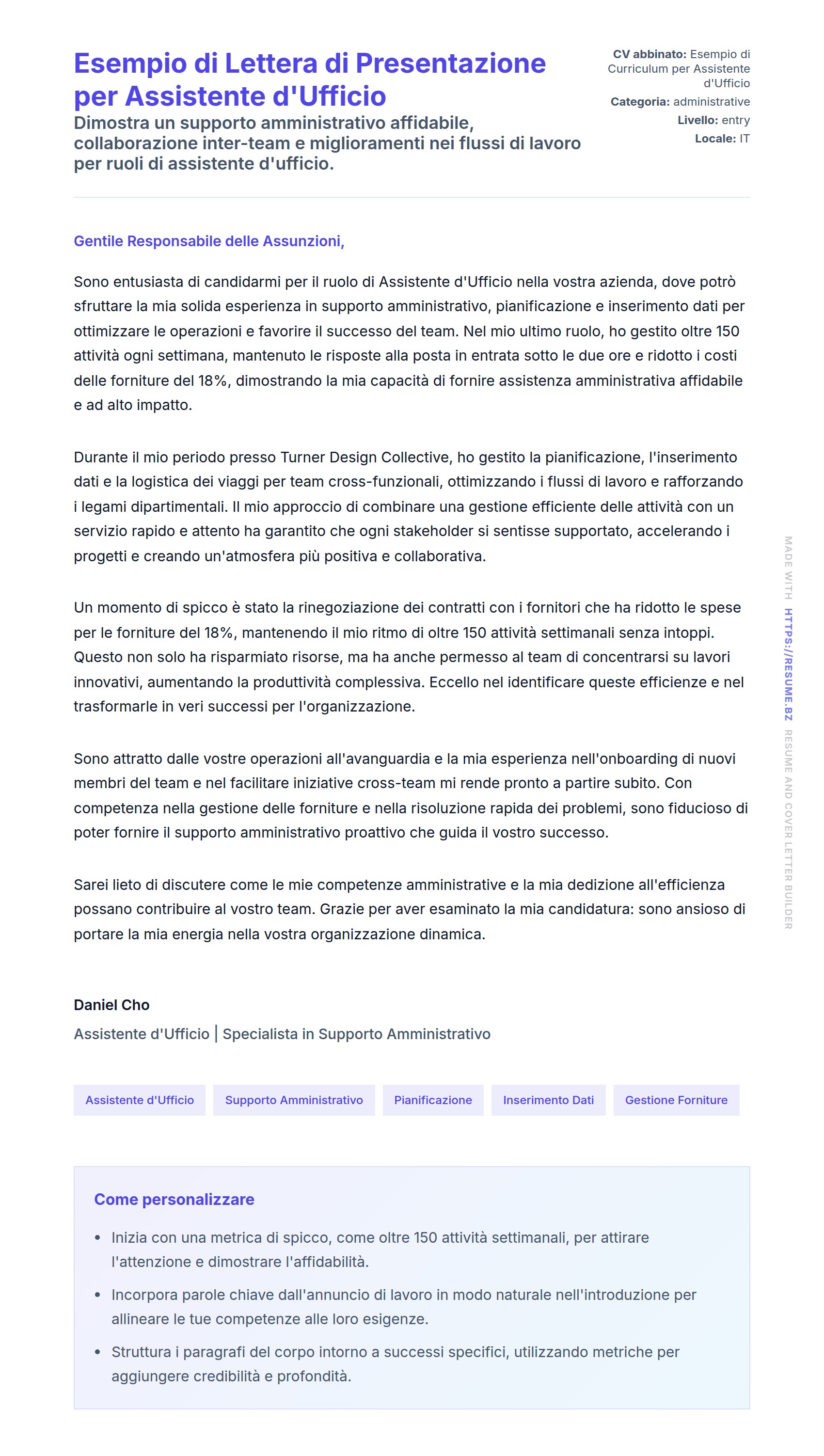 Dimostra un supporto amministrativo affidabile, collaborazione inter-team e miglioramenti nei flussi di lavoro per ruoli di assistente d'ufficio.