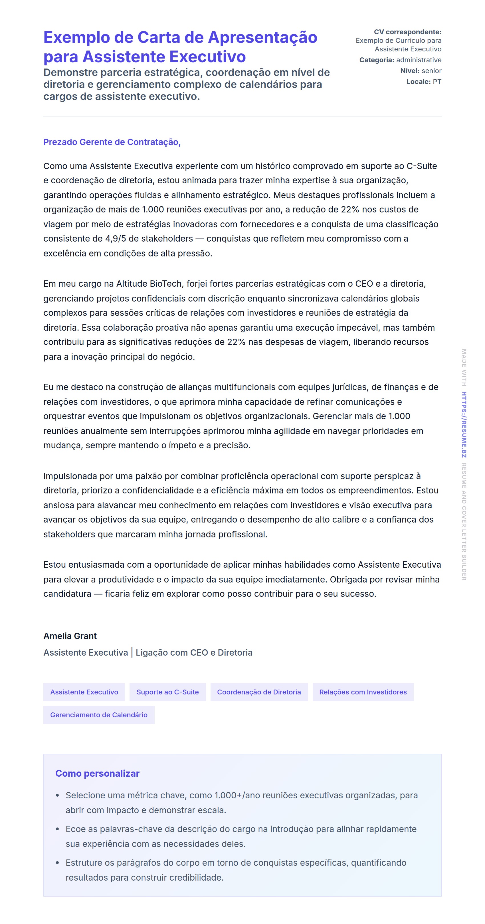Exemplo de Carta de Apresentação para Assistente Executivo