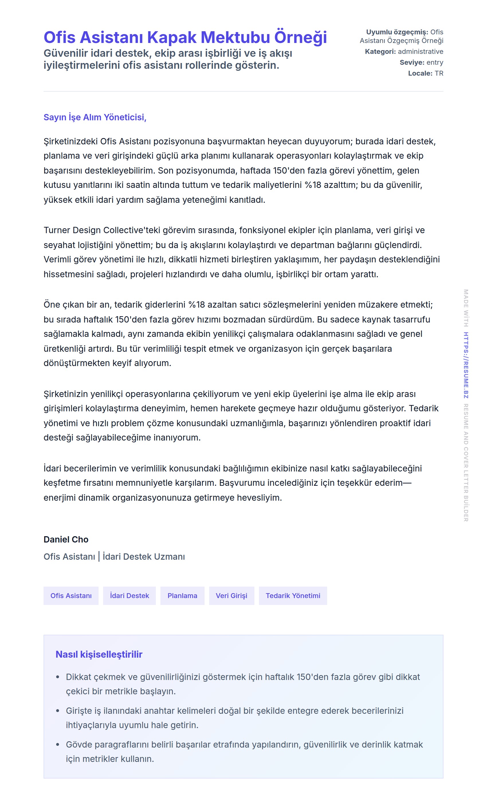 Güvenilir idari destek, ekip arası işbirliği ve iş akışı iyileştirmelerini ofis asistanı rollerinde gösterin.