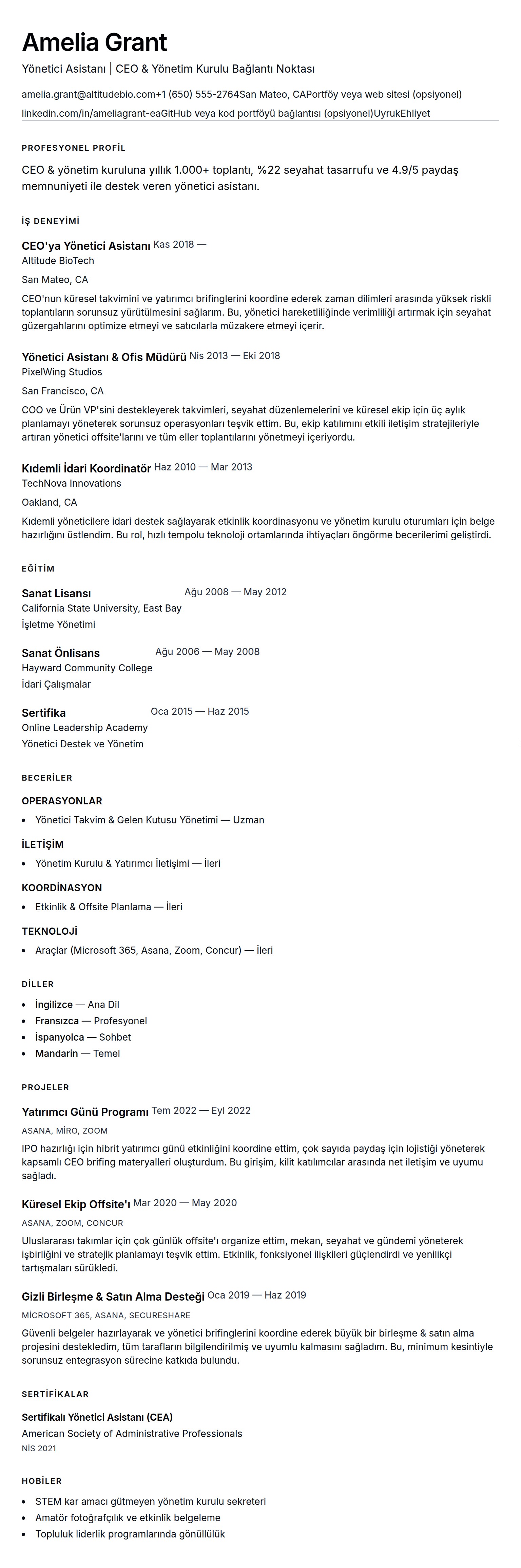 Yönetici Asistanı Özgeçmiş Örneği