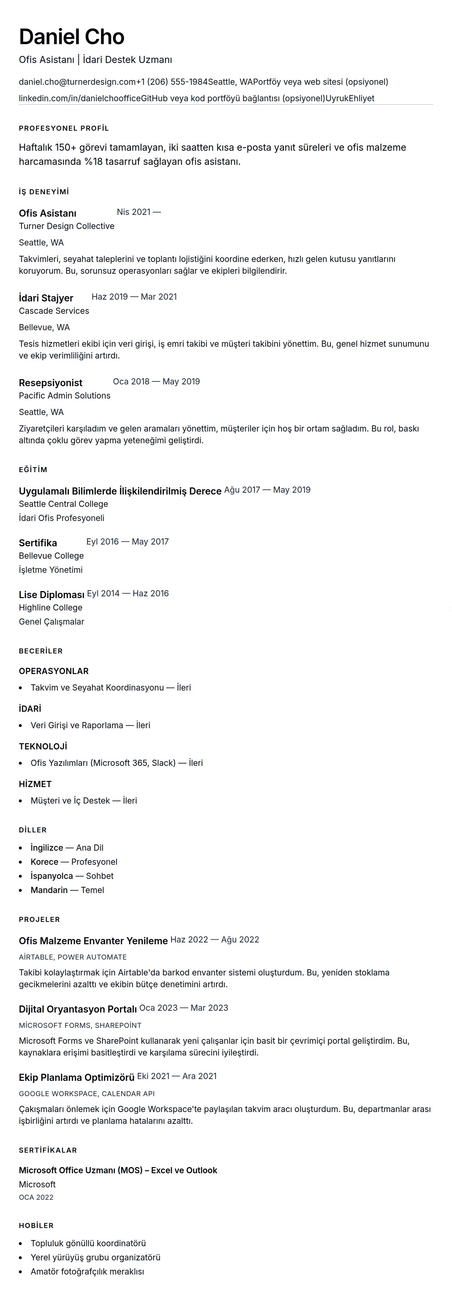 Güvenilir idari destek, ekip arası işbirliği ve iş akışı iyileştirmelerini ofis asistanı rollerinde gösterin.